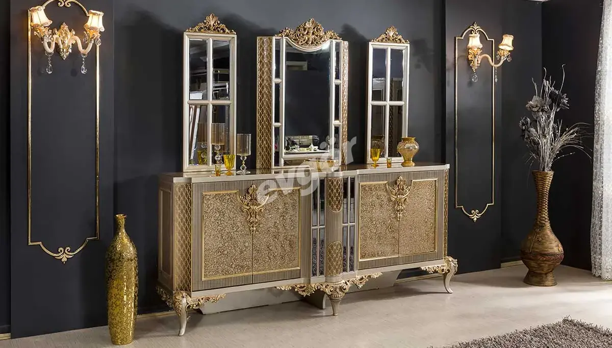 Zarif Oymalar ile kaplı olan bu şık avangardeyemek odası takımı, zarif varaklı detayları ve aksesuarlarıyla göz alıcı bir seçenek sunuyor.