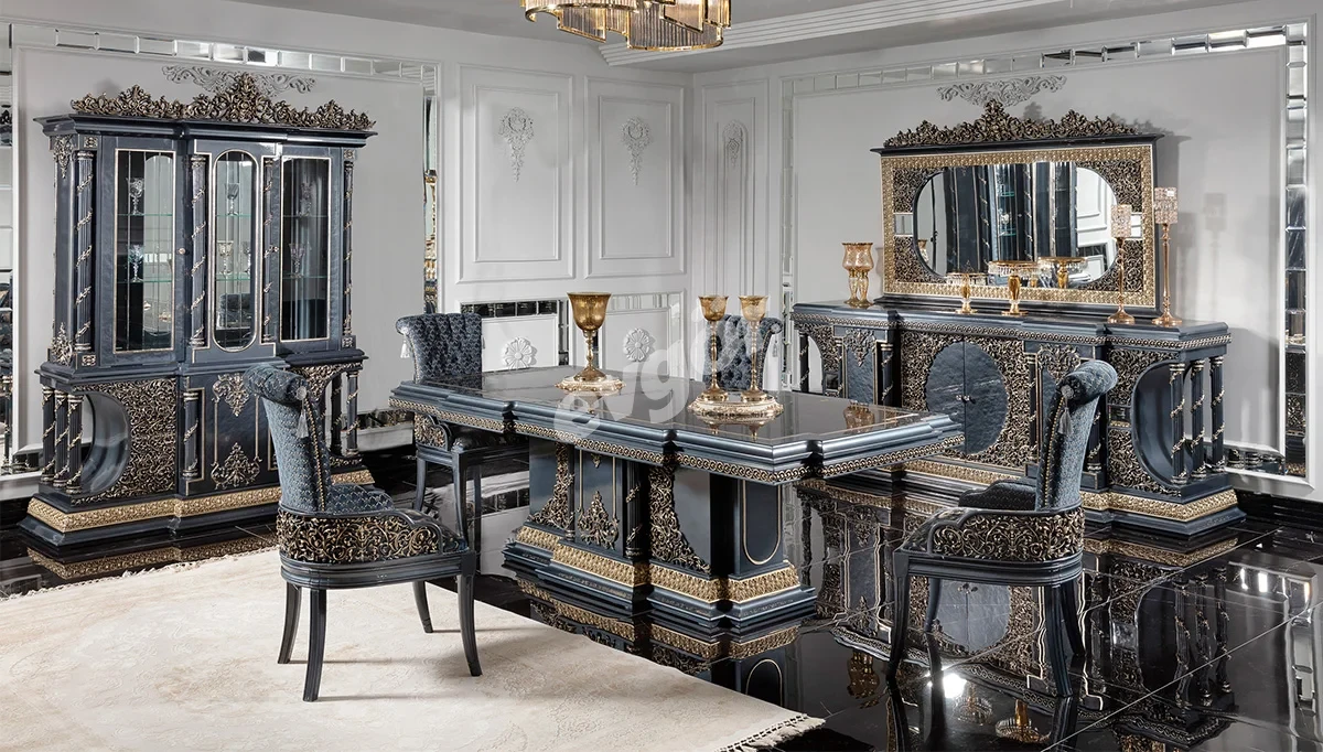 Piraye Mavi Klasik Yemek Odası, şıklığı ve göz alıcı tasarımı ile salonunuzun vazgeçilmezi olacak.