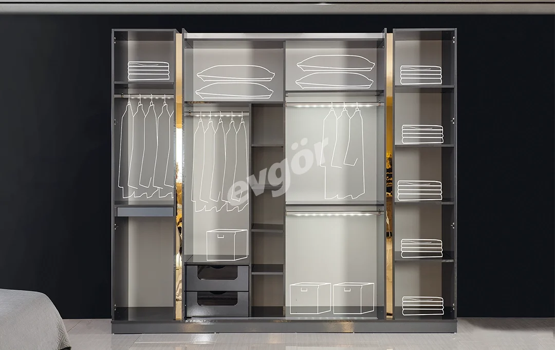 Ürünümüz Dolap, Karyola, Şifonyer, Şifonyer Aynası ve 2 adet Komodin kombinasyonundan oluşmaktadır.