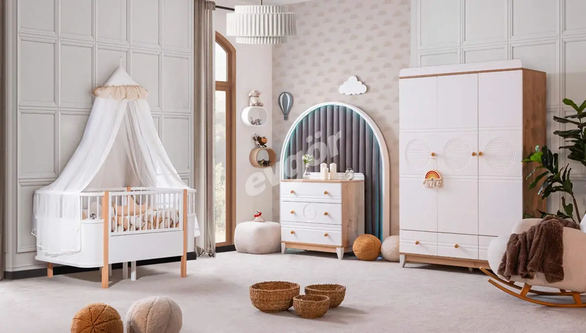 Elvin Meşe Bebek Odası şık ve kullanışlı tasarımı ile kalitenin adresi Evgör Mobilya'da.