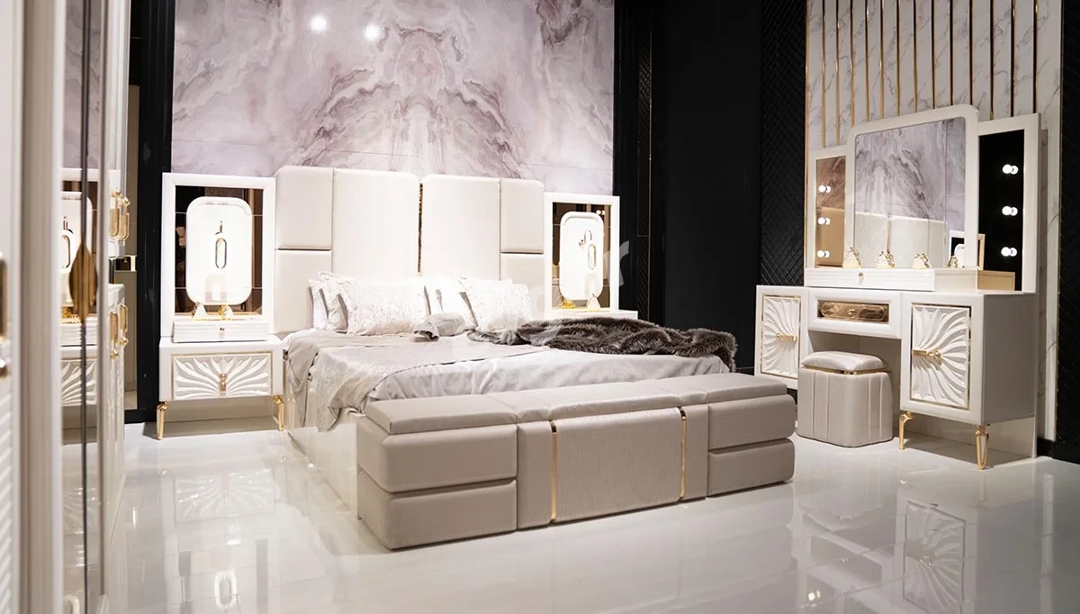 Ürünümüz Lüks Gardırop, Karyola, Şifonyer+Ayna, 2 Adet Komodin, Bench ve Puf kombinasyonundan oluşmaktadır.