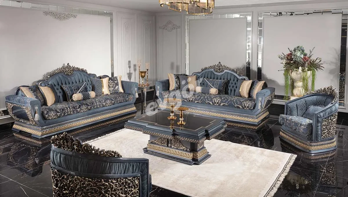 Piraye Mavi Klasik Koltuk Takımı, şıklığı ve göz alıcı tasarımı ile salonunuzun vazgeçilmezi olacak.