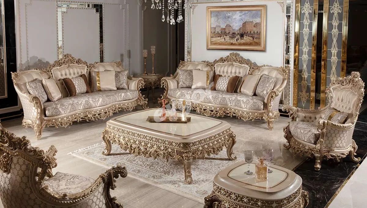 Taç Mahal Krem Klasik Koltuk Takımı, şıklığı ve göz alıcı tasarımı ile salonunuzun vazgeçilmezi olacak.
