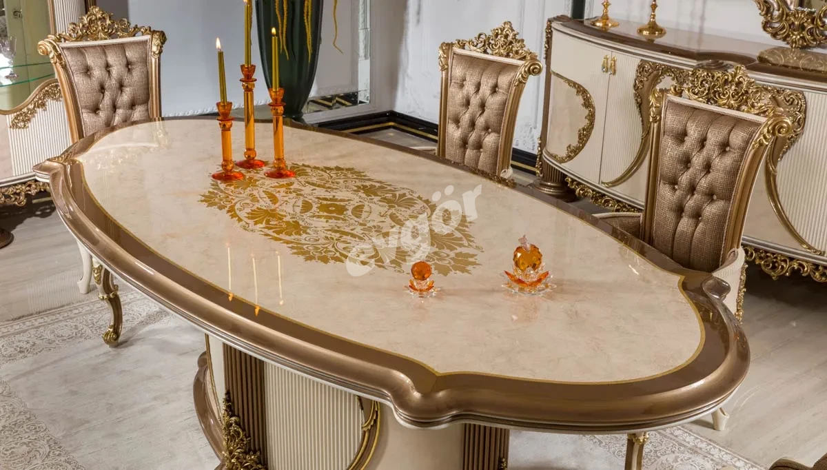 Tuğra Klasik Yemek Odası, şıklığı ve göz alıcı tasarımı ile salonunuzun vazgeçilmezi olacak.