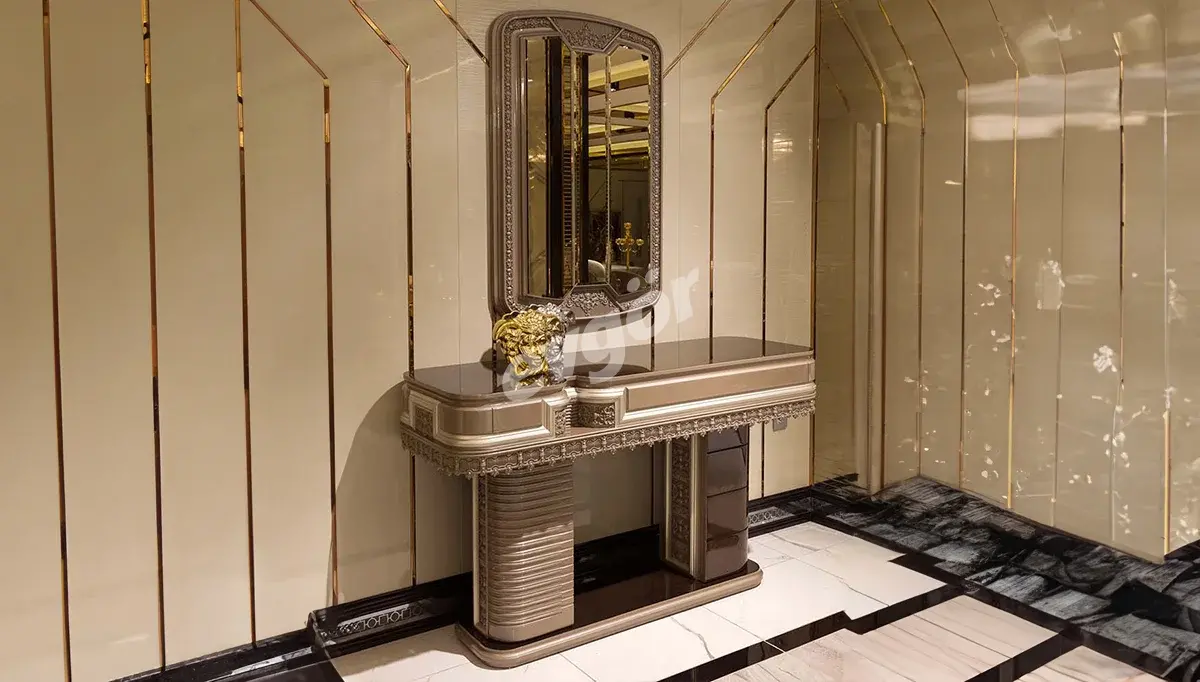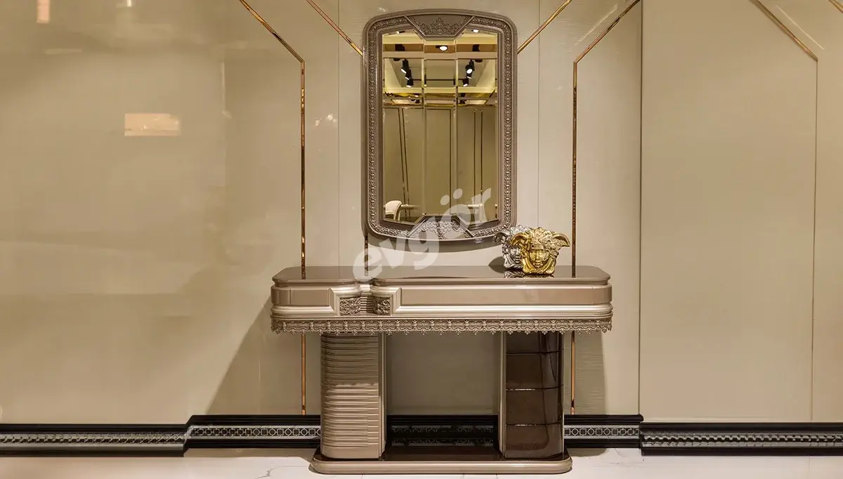 Ürünümüz takım olarak; Konsol, 1 Adet Konsol Aynası, Yemek Masası ve 6 Adet Sandalye'den oluşmaktadır.