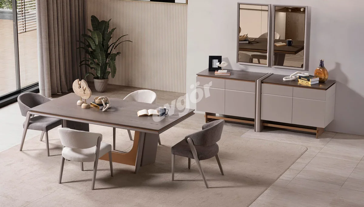 Ürünümüzün Yemek Odası; Konsol, Konsol Aynası, Yemek Masası ve 6 adet Sandalye olarak satışa sunulmaktadır.