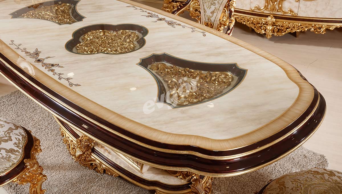 Dilruba Varaklı Klasik Yemek Odası tasarımı ile sizleri etkileyecek ve içinizi ısıtacak lüks tasarımı ile Evgör mobilya da sizleri bekliyor.