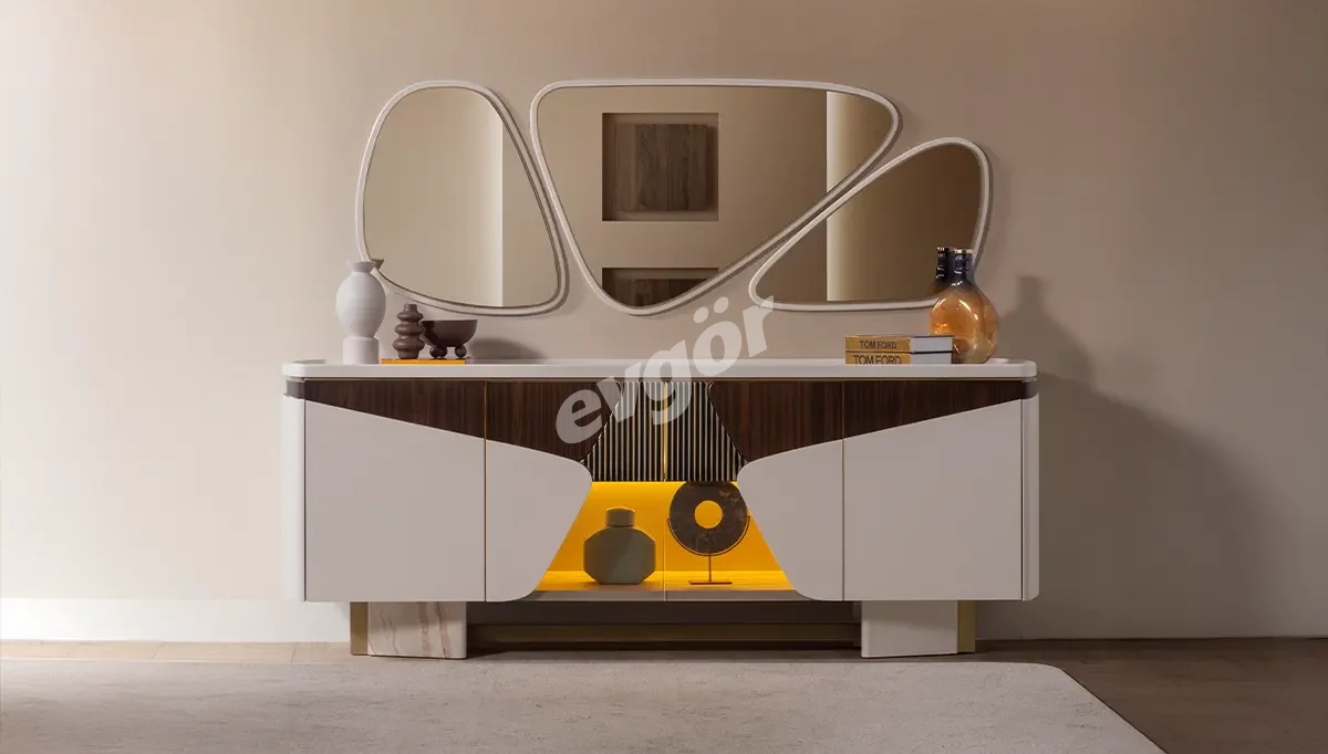 Ürünümüzün Yemek Odası; Konsol, Konsol Aynası, Yemek Masası ve 6 adet Sandalye olarak satışa sunulmaktadır.