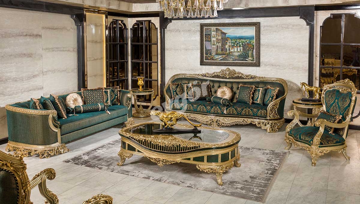 Salonunuza uyum sağlayacak yeşil kadife kumaşı, gösterişli varak detayları ve aksesuarlarıyla muhteşem bir seçenek sunuyor.