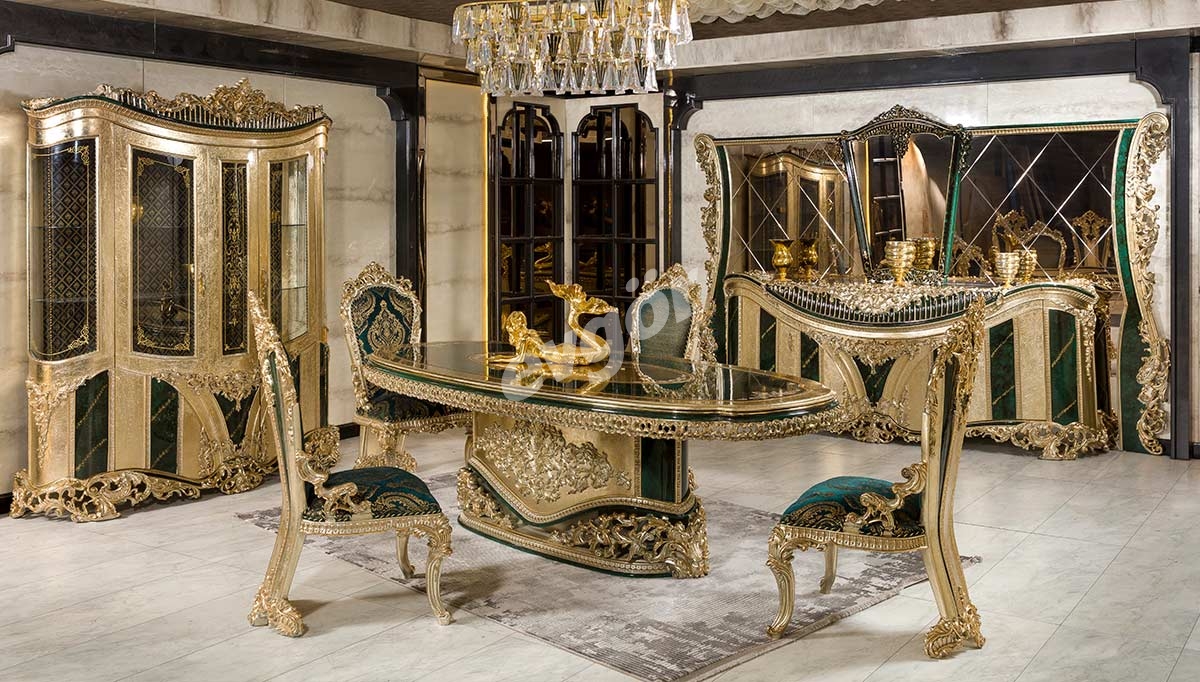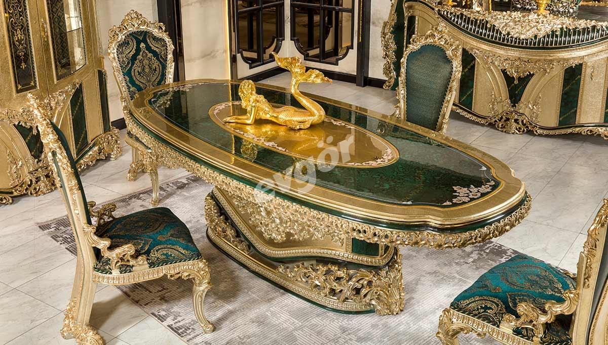 Yeşil kumaşla kaplı olan bu şık klasik yemek odası takımı, zarif varaklı detayları ve aksesuarlarıyla göz alıcı bir seçenek sunuyor.