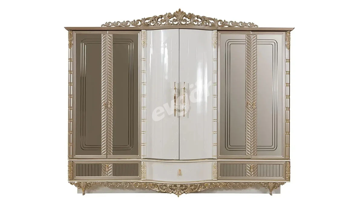 Ürünümüz Lüks Gardırop, Karyola, Şifonyer+Ayna, 2 Adet Komodin, Bench ve Puf kombinasyonundan oluşmaktadır.