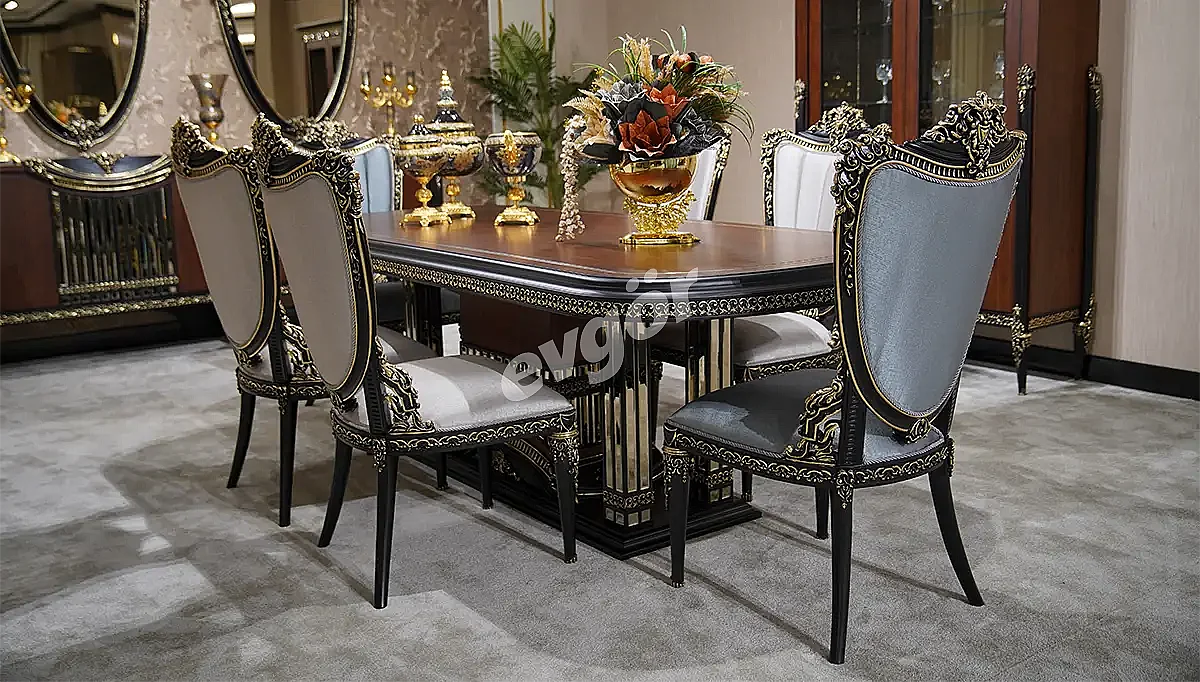 Destina Ceviz Klasik Yemek Odası asaletli ve göz alıcı tasarımı ile Evgör Mobilya'da sizleri bekliyor.