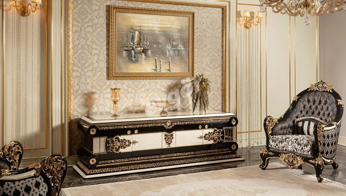 Saraylı Siyah Klasik Yemek Odası, şıklığı ve göz alıcı tasarımı ile salonunuzun vazgeçilmezi olacak.