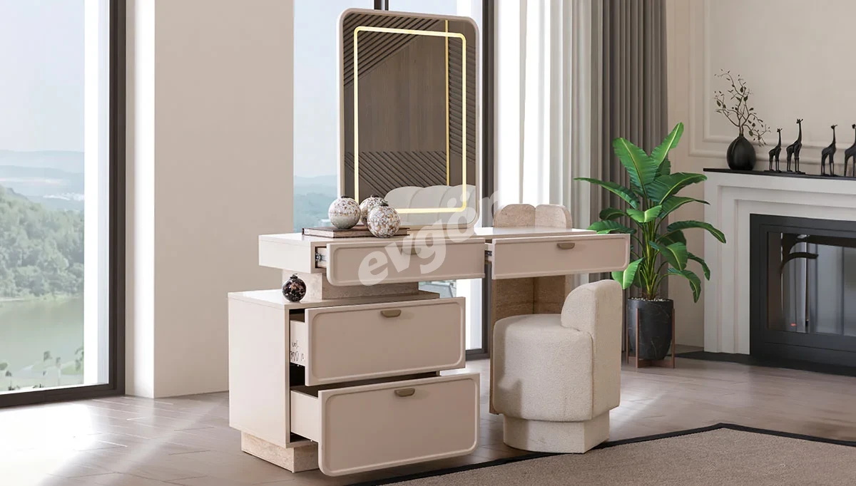 Özellikler: Çekmecelerin veya kapakların üzerine monte edilmiş aynalar, dekoratif detaylar.