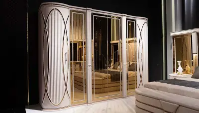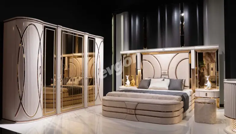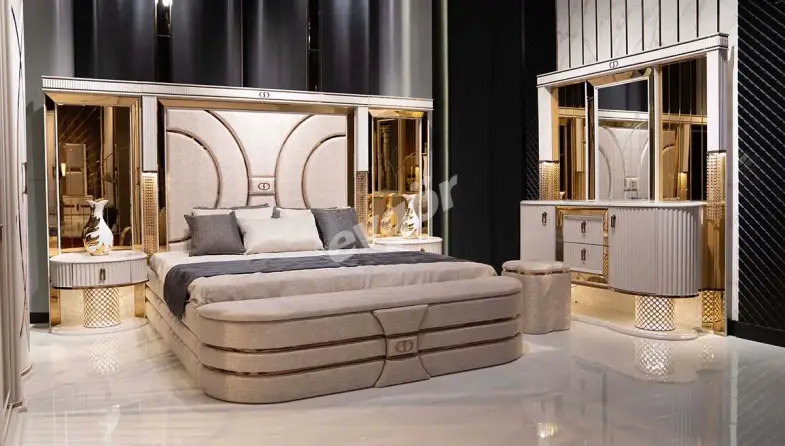 Ürünümüz Lüks Gardırop, Karyola, Şifonyer+Ayna, 2 Adet Komodin, Bench ve Puf kombinasyonundan oluşmaktadır.