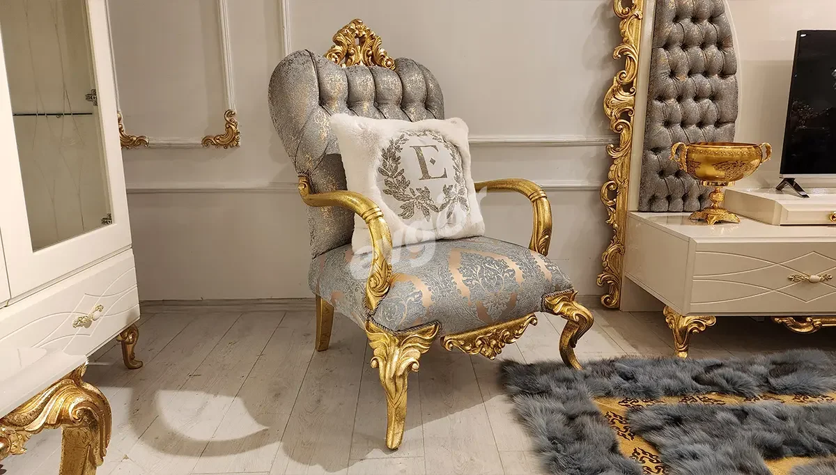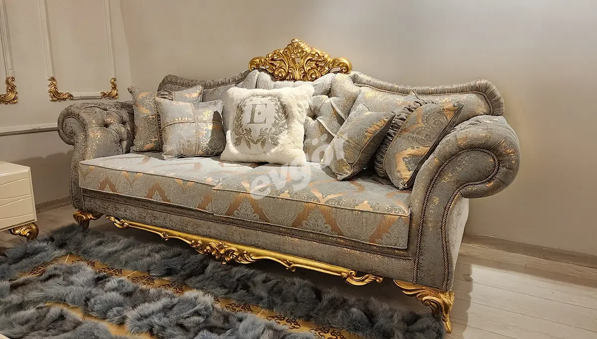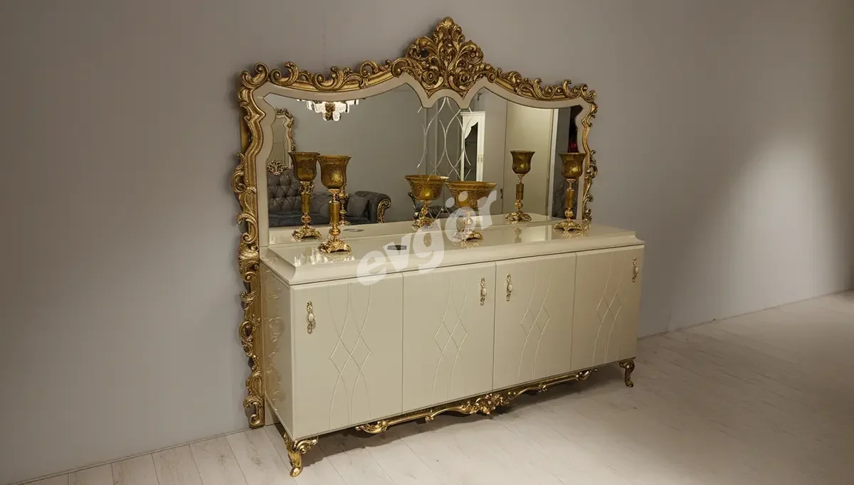 Ürünümüz 3 (Üçlü Koltuk) + 3 (Üçlü Koltuk) + 1 (Berjer) + 1 (Berjer), 1 adet Orta Sehpa Yan Sehpa + Konsol, Konsol Aynası, Yemek Masası, 2 adet Kollu Sandalye, 4 adet Kolsuz Sandalye ve Gümüşlük kombinasyonundan oluşmaktadır.