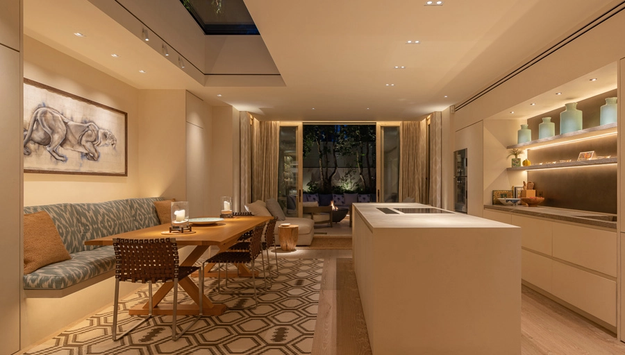 Yumuşak beyaz ışık ve açık renkli mobilyalar huzur verirken, koyu renk mobilyalarla birleşen sıcak ışıklar samimi ama iddialı bir atmosfer oluşturur.
