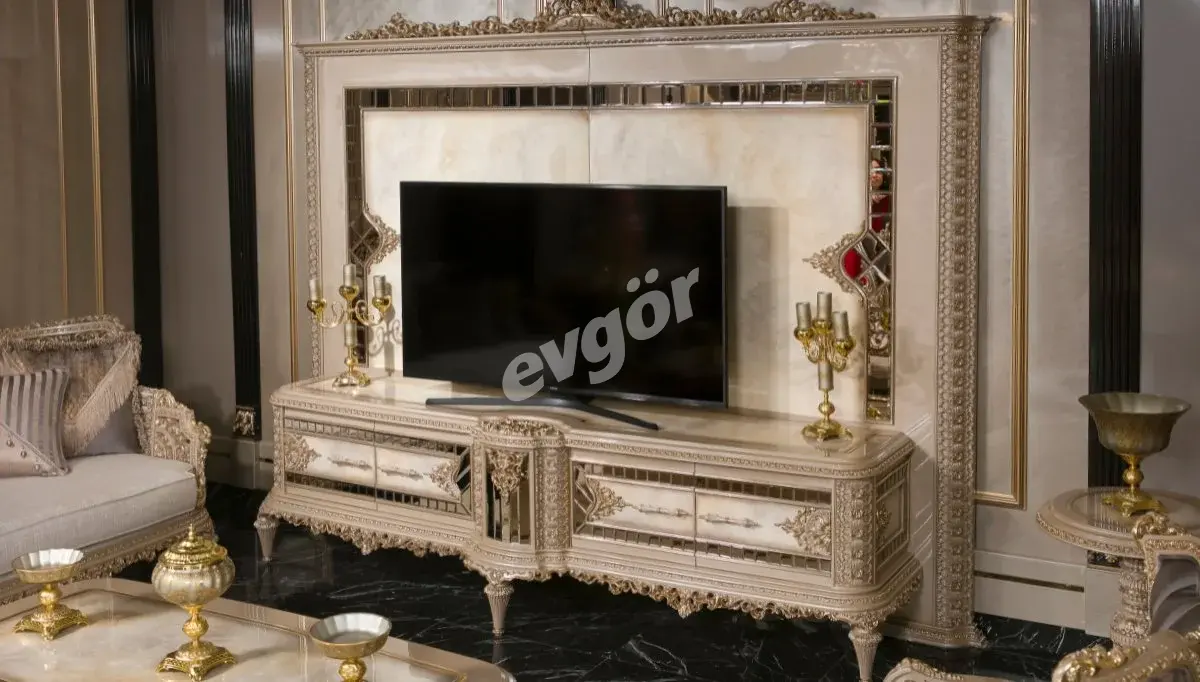Laleli Krem Klasik Tv Ünitesi, TV Sehpası ve TV Panosu olmak üzere 2 parçadan oluşmaktadır.