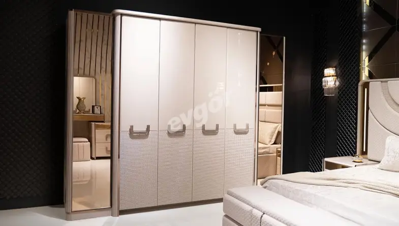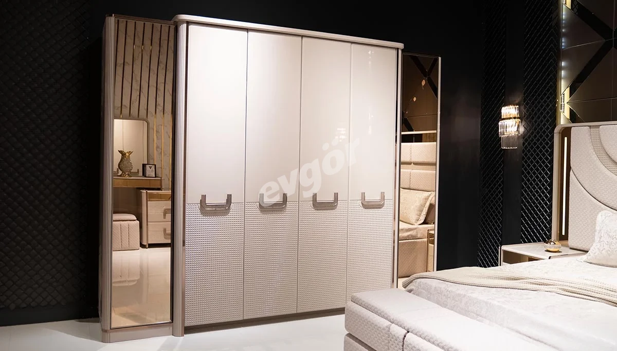 Ürünümüz Lüks Gardırop, Karyola, Şifonyer+Ayna, 2 Adet Komodin, Bench ve Puf kombinasyonundan oluşmaktadır.