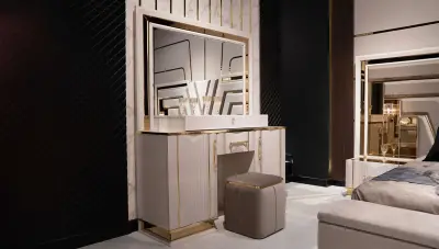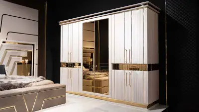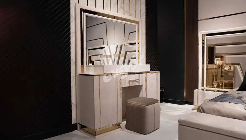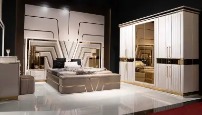 Ürünümüz Lüks Gardırop, Karyola, Şifonyer+Ayna, 2 Adet Komodin, Bench ve Puf kombinasyonundan oluşmaktadır.