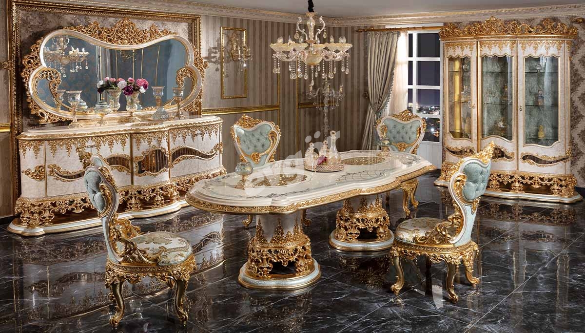 Melikşah Klasik Yemek Odası şık tasarımı ile odanızın havasını değiştirecek olan bu ürün rakipsiz fiyatların değişmeyen adresi Evgör Mobilyada.