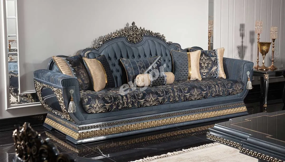 Piraye Mavi Klasik Üçlü Koltuk, şıklığı ve göz alıcı tasarımı ile salonunuzun vazgeçilmezi olacak.