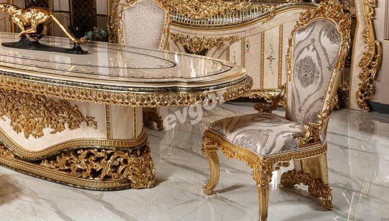Yeşil kumaşla kaplı olan bu şık klasik yemek odası takımı, zarif varaklı detayları ve aksesuarlarıyla göz alıcı bir seçenek sunuyor.