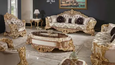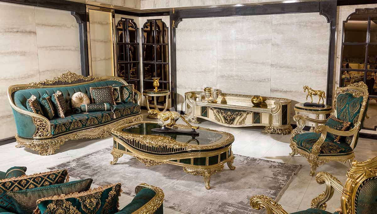 Salonunuza uyum sağlayacak yeşil kadife kumaşı, gösterişli varak detayları ve aksesuarlarıyla muhteşem bir seçenek sunuyor.