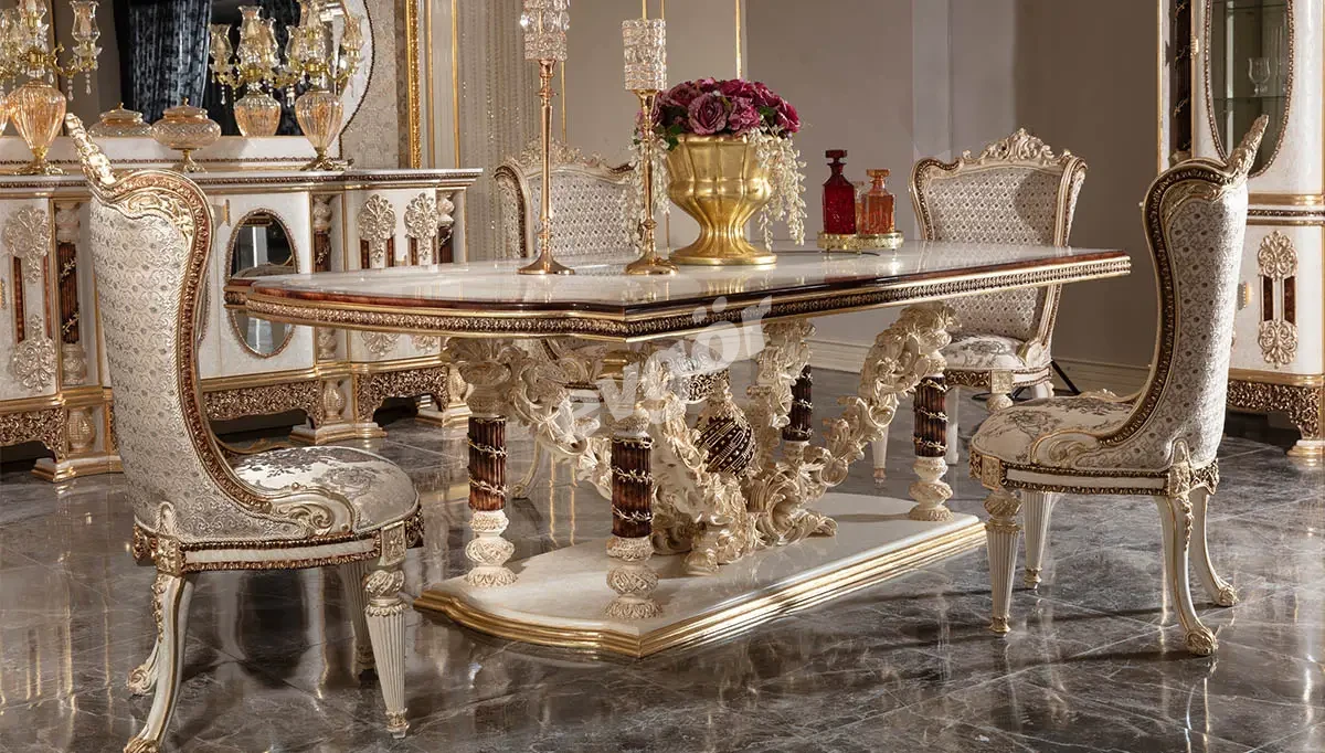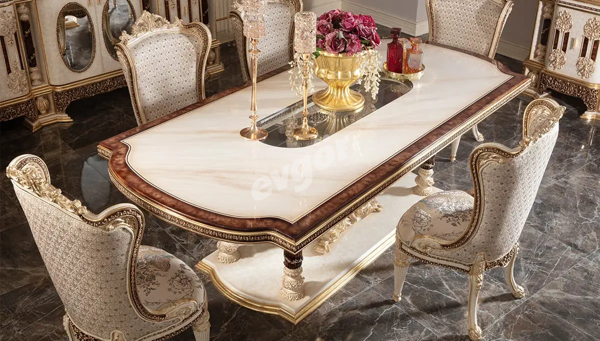 Şahmaran Krem Klasik Yemek Odası, şıklığı ve göz alıcı tasarımı ile salonunuzun vazgeçilmezi olacak.