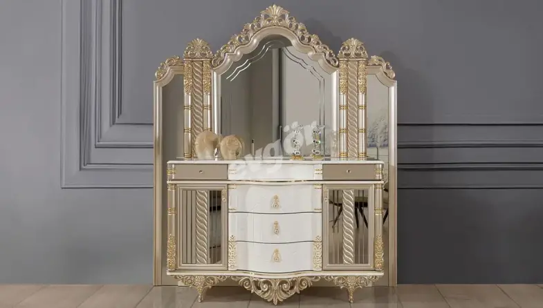 Ürünümüz Lüks Gardırop, Karyola, Şifonyer+Ayna, 2 Adet Komodin, Bench ve Puf kombinasyonundan oluşmaktadır.