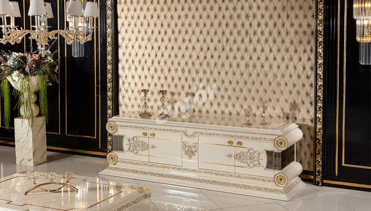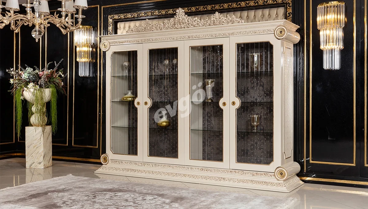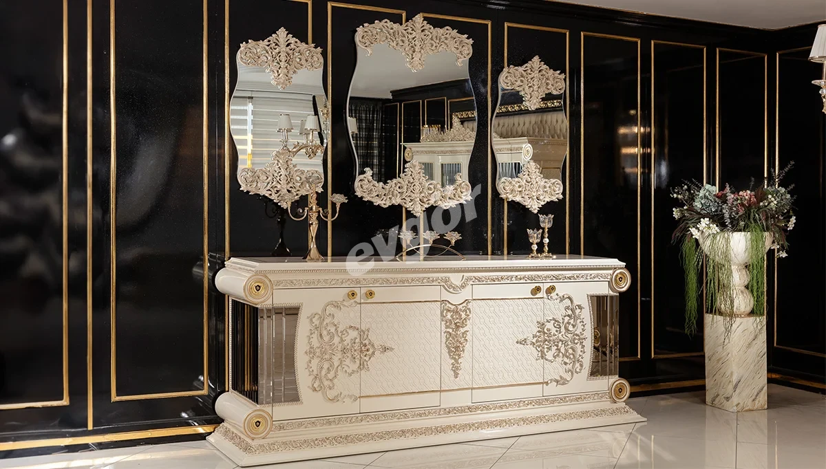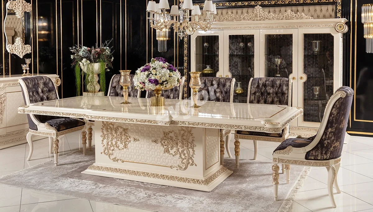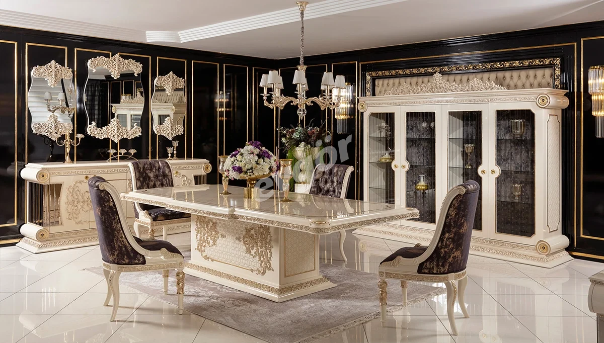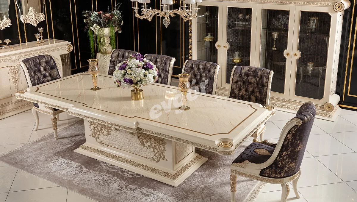 Saraylı Krem Klasik Yemek Odası, şıklığı ve göz alıcı tasarımı ile salonunuzun vazgeçilmezi olacak.