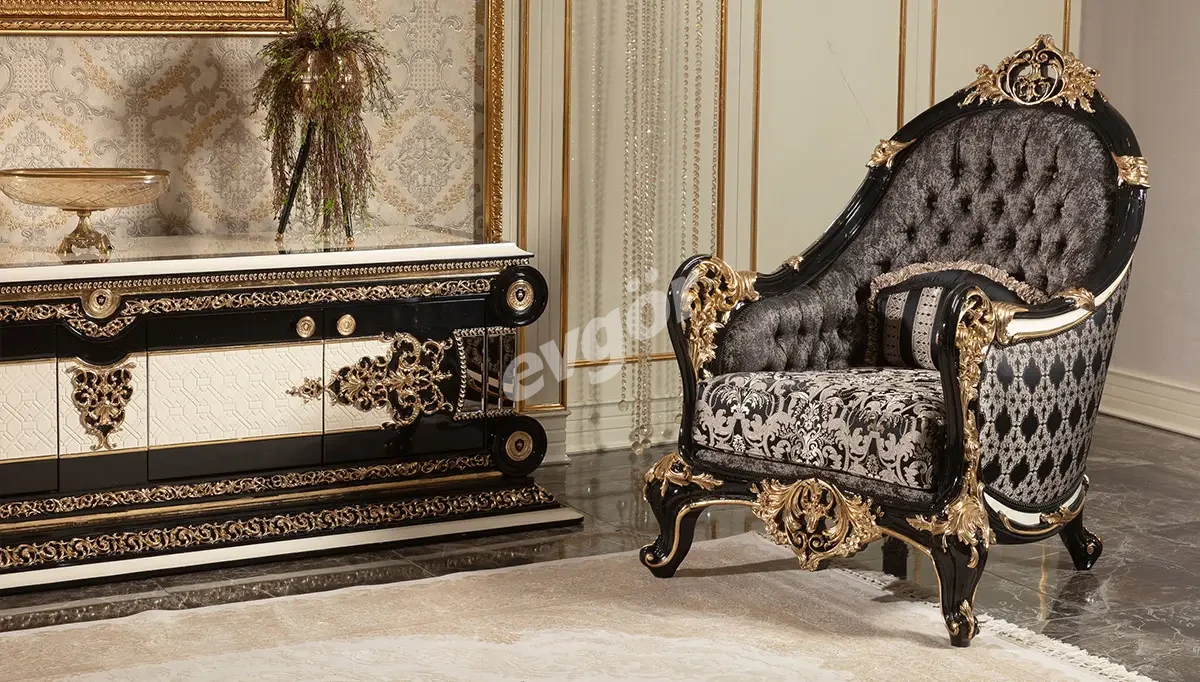 Saraylı Siyah Klasik Tekli Koltuk, şıklığı ve göz alıcı tasarımı ile salonunuzun vazgeçilmezi olacak.