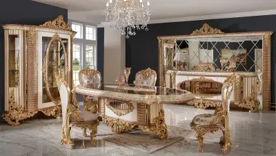 Masa ve sandalyelerde dikkat çeken şık motifler, yemeklerinizi adeta şölene dönüştürmek için tasarlanmıştır. Sandalyeler taçlı ve sırt bölümleri kapitoneli olarak imal edilmektedir.