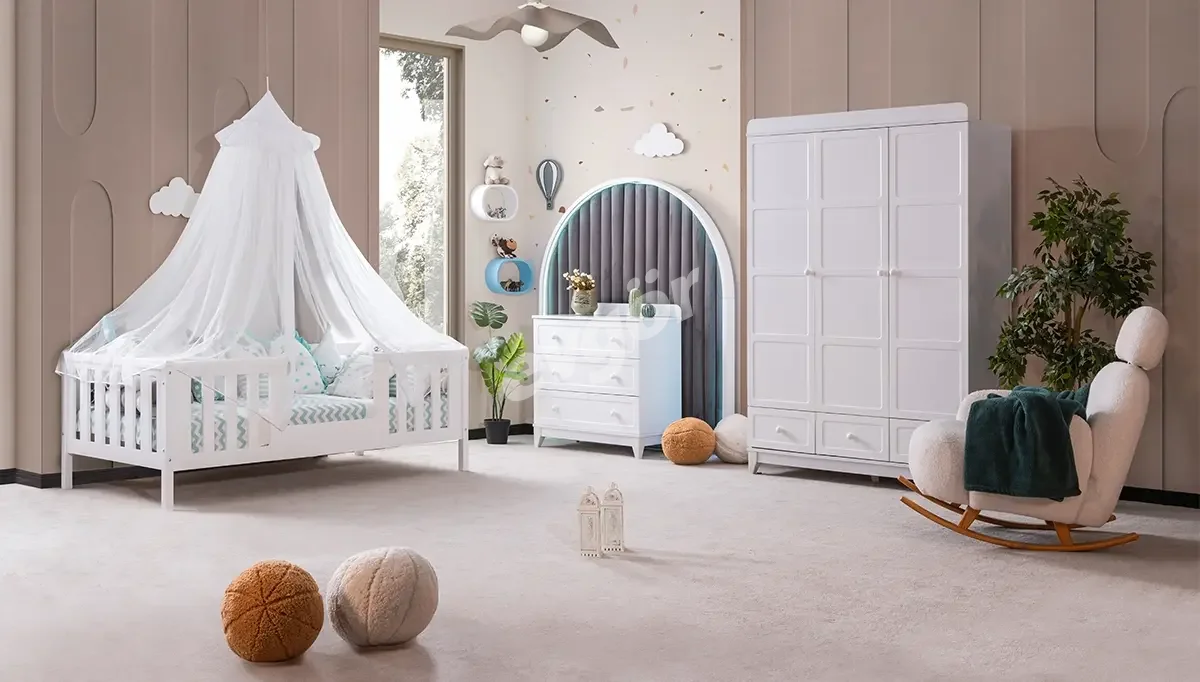 Beril Beyaz Cibinlikli Çocuk Odası şık ve kullanışlı tasarımı ile kalitenin adresi Evgör Mobilya'da.