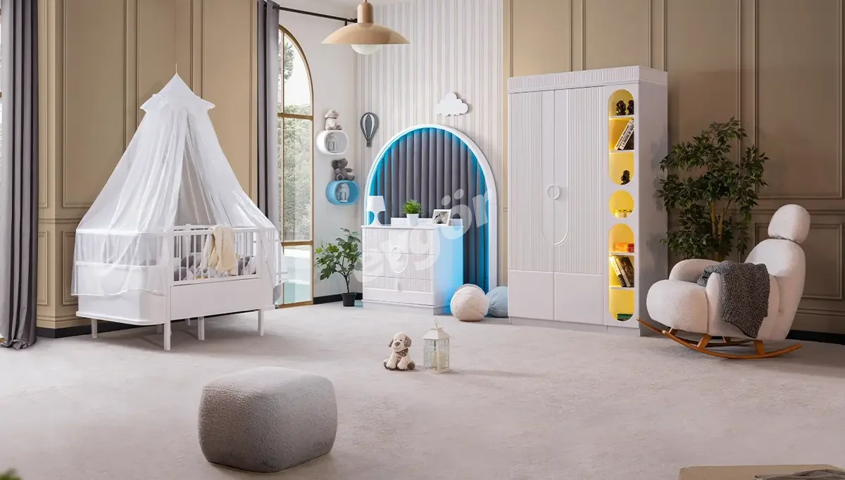 Ravi Beyaz Cibinlikli Bebek Odası şık ve kullanışlı tasarımı ile kalitenin adresi Evgör Mobilya'da.