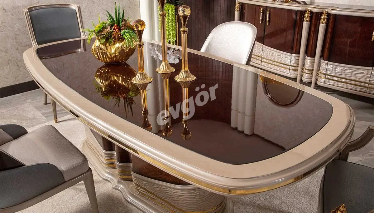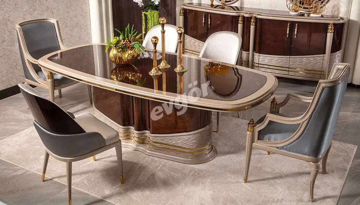 Valeria Ceviz Yemek Odası, şıklığı ve göz alıcı tasarımı ile salonunuzun vazgeçilmezi olacak.