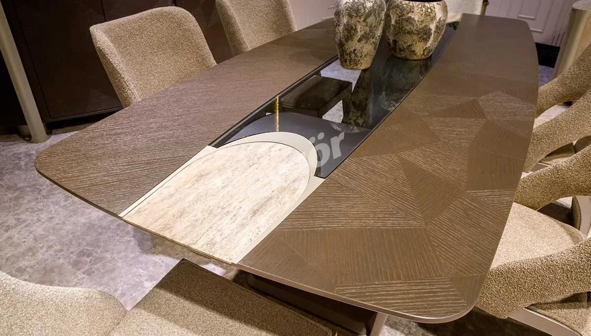 Her ne kadar ahşap, sık kullanılan bir materyal olsa da farklı kaplama ve desenleme teknikleriyle farklı desenlere de bürünebilmektedir. Mermer desenli yemek masası modelleri buna en iyi örnektir. Mermer görünümlü olması sebebiyle şık duran bu masalar, aynı zamanda ahşap materyal kullanıldığı için oldukça hafif olmakta ve rahat bir kullanım sağlamaktadır.